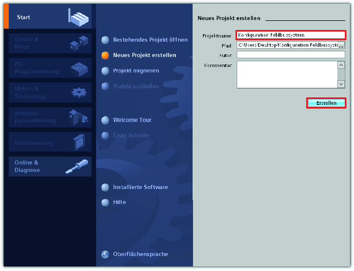 - Erstellen Sie ein neues TIA‑Portal-Projekt. Vergeben Sie einen Projektnamen und bestimmen Sie den Speicherort des Projekts.