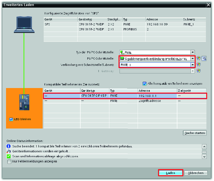 - Markieren Sie die gefundene SPS und laden Sie diese ins TIA‑Portal-Projekt.