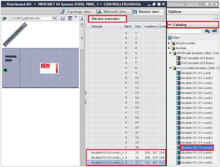 - Use drag and drop to insert the process data modules from the hardware catalog with the desired number of process data words into the device overview. Insert the process data modules in the order in which the MOVIKIT® software modules are assigned to the subordinate inverters. Note that the number of process data words required depends on the MOVIKIT® software module used (see Starting up the MOVIKIT® software module).