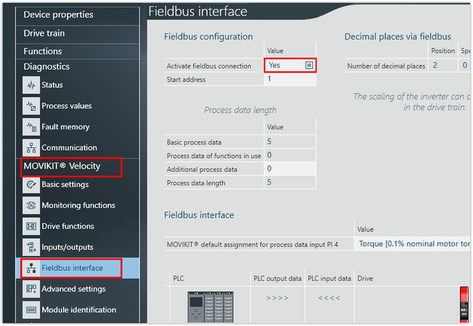 - Abra la configuración del variador y active la conexión de bus de campo del módulo de software en el grupo de parámetros [MOVIKIT® Velocity] > [Interfaz de bus de campo].