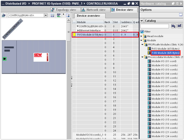 - Desde el catálogo de hardware, añada los módulos de datos de proceso con el número deseado de palabras de datos de proceso a la vista general de unidades mediante la función de arrastrar y soltar. Añada los módulos de datos de proceso en el orden en el que los módulos de software MOVIKIT® están asignados a los variadores de nivel inferior. Tenga en cuenta que el número de palabras de datos de proceso necesarias depende del módulo de software MOVIKIT® utilizado (véase Puesta en marcha del módulo de software MOVIKIT®).