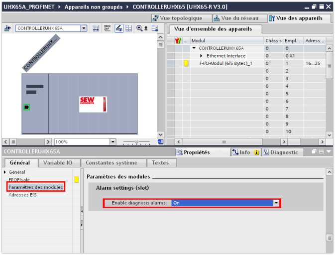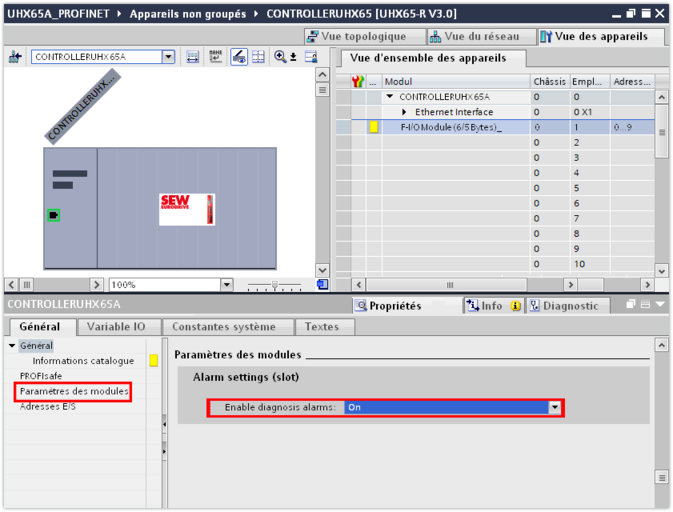 - Activer l'alarme de diagnostic dans la fenêtre de contrôle (partie inférieure de l'éditeur), dans le bloc "Paramètres des modules" (module parameters).
