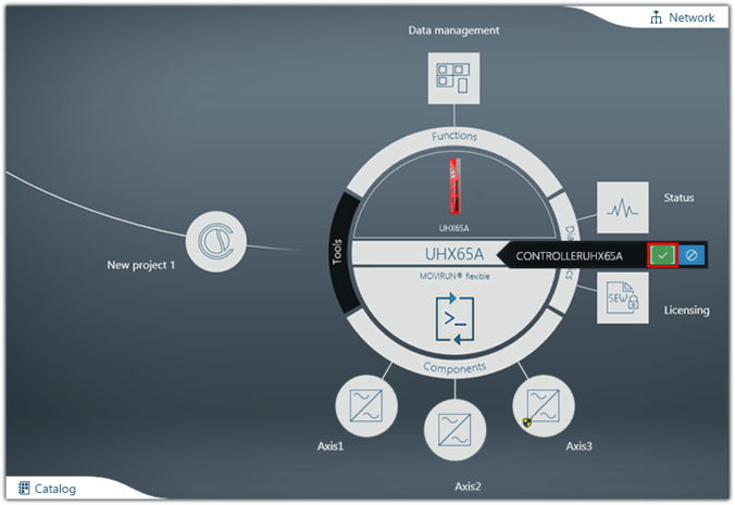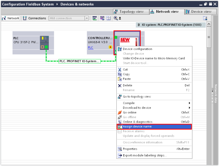 A colocação em operação será explicada mais detalhadamente em um exemplo. Por exemplo, um MOVI‑C® CONTROLLER progressive UHX65A‑R está integrado em uma rede PROFINET.