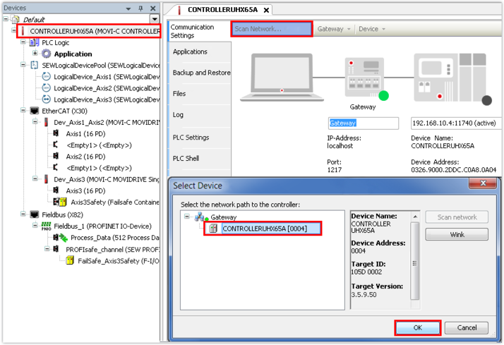 将通过示例更详细地对调试进行介绍。在本示例中,MOVI‑C® CONTROLLER progressive UHX65A‑R接入PROFINET网络中。