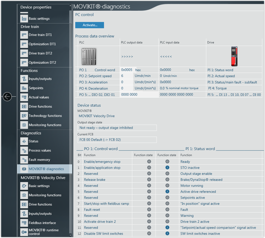 - In control mode (PC control), the process data via fieldbus interface are disabled which means the process data can be specified using the user interface of MOVIKIT® diagnostics. The data are sent to the inverter automatically and continuously and take effect immediately.