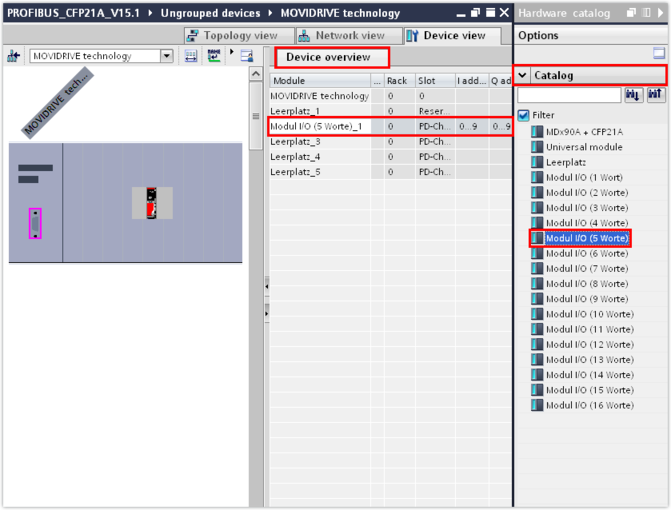 - Aprire il catalogo hardware. In [Other field units] > [PROFIBUS DP] > [Drives] > [SEW‑EURODRIVE] > [MOVI-C MOVIDRIVE] selezionare la voce per l'inverter applicazione MOVIDRIVE® technology e assegnarlo al PLC nella vista delle reti.