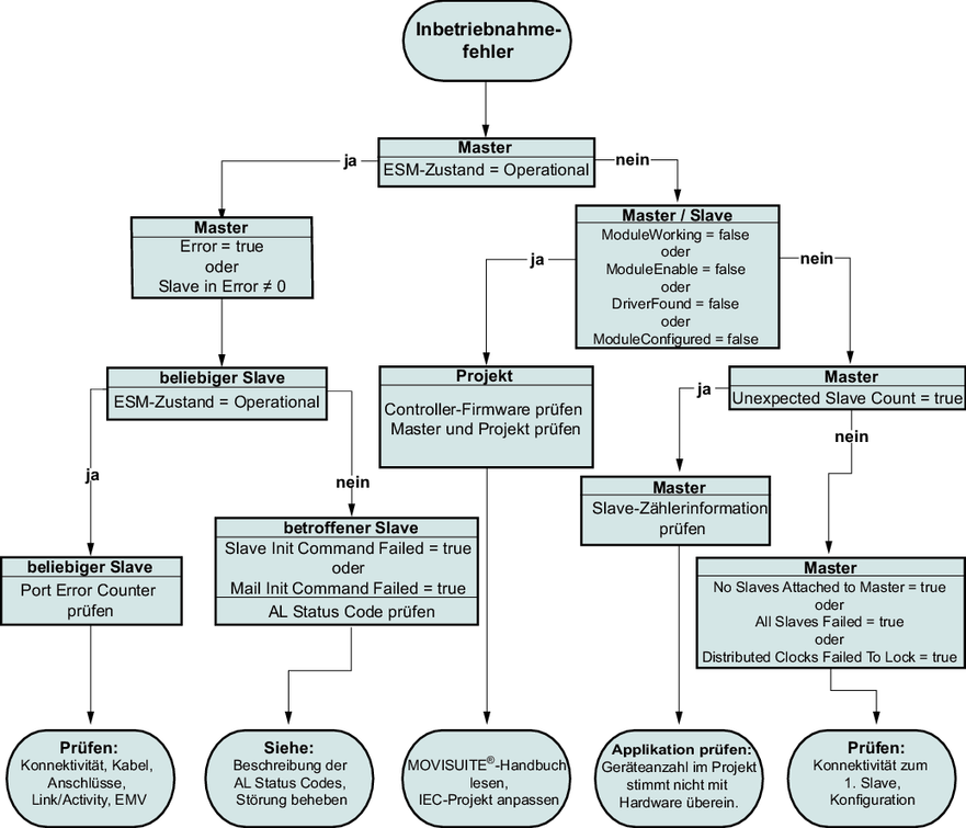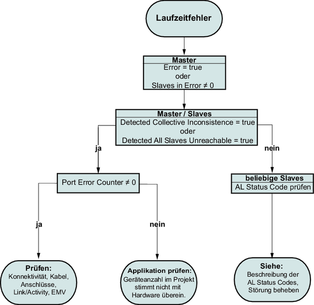 Folgende Diagramme zeigen Vorschläge für die Vorgehensweise bei einer Fehlersuche. Unterschieden wird zwischen Fehlern, die während der Inbetriebnahme entstehen und Fehlern während der Laufzeit: