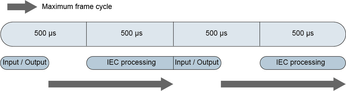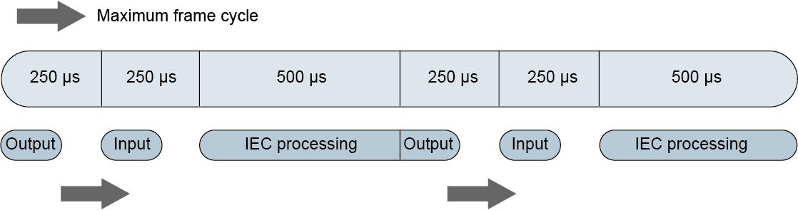 - Once the outputs of the process image have been written to the EtherCAT® frame, the inputs from the EtherCAT® frames are copied to the next PLC slot. The current data of theEtherCAT® frame are used for this purpose. This mode is suited for highly dynamic processes and is set by default.