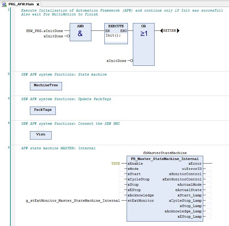 In "Main", the basic components of the AFW are called. The first three calls do not require any adjustment by the user. These steps check whether the initialization has been carried out correctly. There are three system calls for this purpose: the machine tree, the pack tags, and the visualization are called at the beginning of "Main".