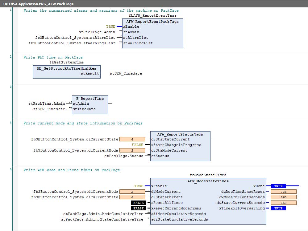 The system functions for the pack tags are implemented under "PRG_AFW.PackTags". Generally, no changes are required in this part of the AFW. The pack tags are used as an interface to higher-level controllers or neighboring controllers. No command tags are used in the AFW but status tags are assigned. For machine control, SEW‑EURODRIVE recommends the machine module for machine control that acts as the master and not the pack tags. If the user wants to use the pack tags, it is recommended to connect them to an “FB_Master_StateMachine_External”.