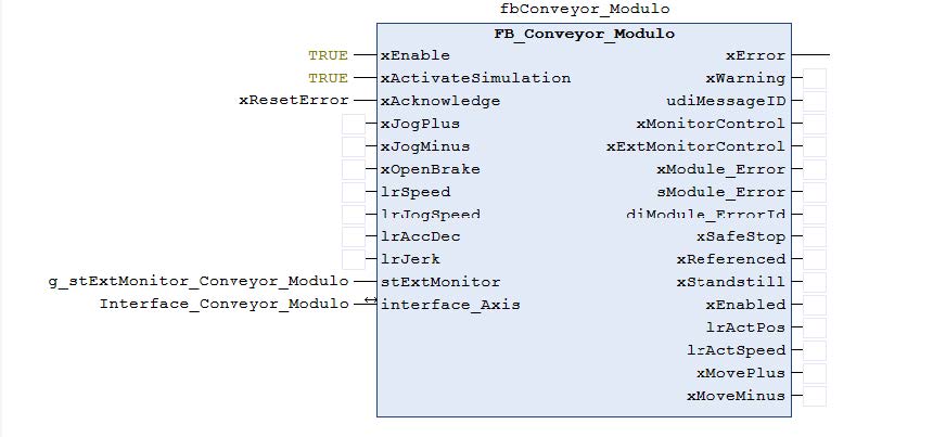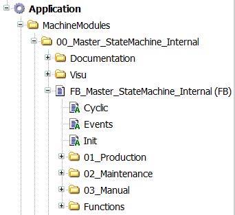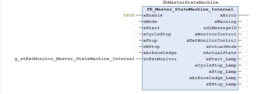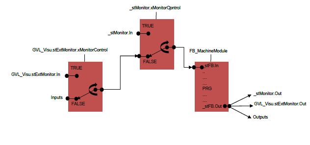 The "MachineModules" are called in "Main" and have inputs to which data is fed. The example in the manual shows the control of the machine modules. The user defines the inputs on the machine modules and originate from process data, digital inputs, the HMI or a combination of them. A mapping FB is recommended for a great number of input data. For a few inputs, establish the connection directly in "PRG_AFW.Main".