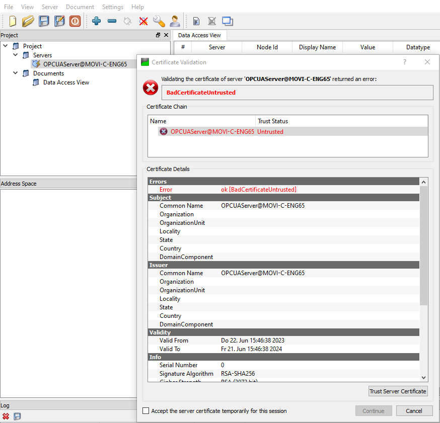 Damit das selbstsignierte Zertifikat in die Liste der "managed certificates" übernommen wird, muss der Bediener dem Zertifikat beim ersten Verbindungsaufbau mit dem Server manuell vertrauen.