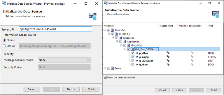 - Add a "Data source" object below the "Data Sources Manager" object that establishes the connection with an OPC UA server. For this purpose, the OPC UA server must be active in the network and can be searched.