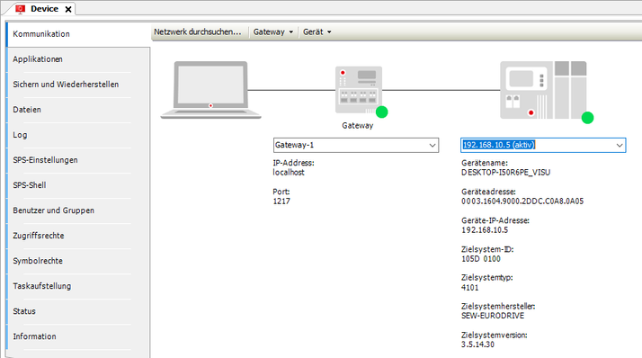 - Systemseitiges Auslesen der Kommunikationseinstellungen des IEC-Projekts (empfohlen). Verwenden Sie dazu beim Konfigurieren der Datenquelle die Option "Von den Kommunikationseinstellungen". Für diese Methode ist eine aktive Verbindung zwischen Engineering-PC und dem Steuerungsteil des MOVI-C® CONTROLLER erforderlich. Weitere Informationen zu dieser Methode finden Sie im Kapitel Netzwerk-verfügbare Visualisierung.