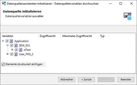 - Auswählen der Variablen, die im Visualisierungsprojekt zur Verfügung stehen sollen. Die verfügbaren Variablen aus der importierten Symboldatei werden in der jeweiligen Struktur aufgelistet und die gewünschten Variablen können über Kontrollfelder an- bzw. abgewählt werden (siehe Beispiel im Screenshot).