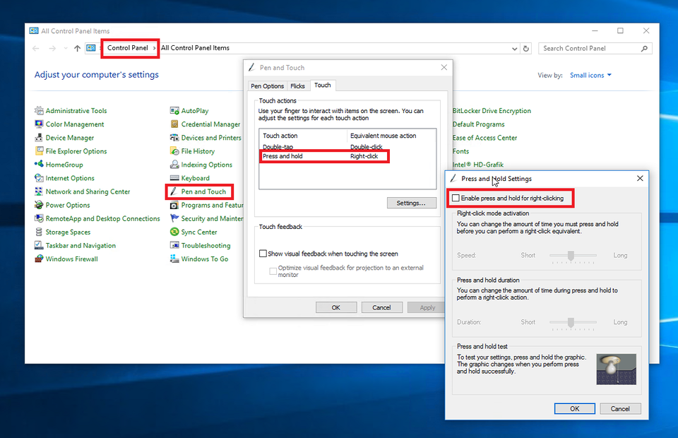 - Deaktivieren Sie im Menü "Press and Hold Settings" das Kontrollfeld "Enable press and hold for right-klicking".