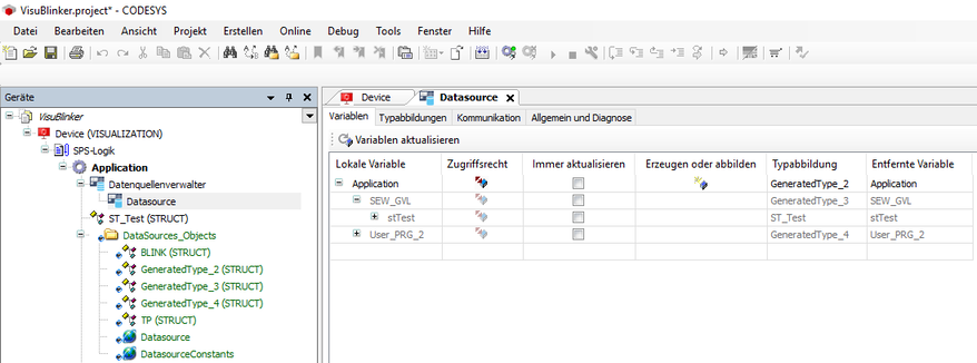 The required variables for the visualization project are read from the IEC project via the communication settings and made available in the visualization project.