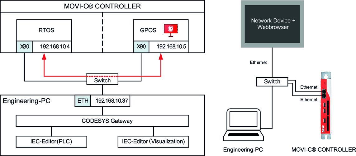 Data is exchanged between the IEC project and the visualization project via the physical network interfaces X80 and X90 of the MOVI-C® CONTROLLER and the network switch (red arrow in the graphic). The data source is thus configured for the use of the physical network interface X80. By default, the physical network interface X80 of the MOVI-C® CONTROLLER has the IP address 192.168.10.4 assigned to it. Access from the engineering PC to the Windows part of the MOVI-C® CONTROLLER (e.g. for loading the visualization project) is implemented via the physical network interface X90. By default, the physical network interface X90 of the MOVI-C® CONTROLLER has the IP address 192.168.10.5 assigned to it.