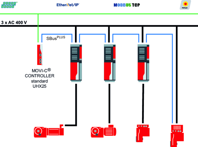 - Der MOVI-C® CONTROLLER arbeitet als Feldbusgerät (hier PROFINET-Device am PROFINET-Netzwerk) und leitet die Feldbus-Sollwerte und Feldbus-Istwerte über die SBusPLUS-Schnittstelle an die Umrichter weiter.