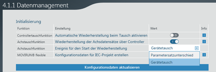 Die Funktion "Wiederherstellung der Achsdatensätze über Controller" kann in MOVISUITE® in der Parameteransicht des Controllers unter [Datenmanagement] aktiviert werden. Über das Auswahlfeld "Ereignis für den Start der Wiederherstellung" im gleichen Konfigurationsmenü gibt es folgende Optionen: