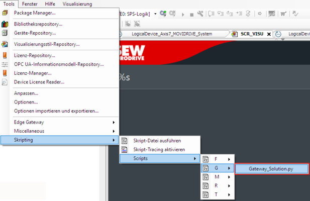 - Führen Sie im IEC Editor unter [Tools] > [Skripting] > [Scripts] > [G] das Skript "Gateway_Solution" aus.