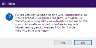 - Die erforderliche Lizenz für das Softwaremodul MOVIKIT® Web Visualization (SMK1504-020, SMK1504-040 oder SMK1504-060) muss vorhanden sein. Wenn diese Lizenz nicht vorhanden ist, klicken Sie im folgenden Dialog auf die Schaltfläche [No].