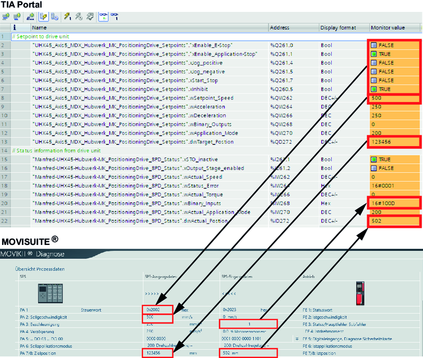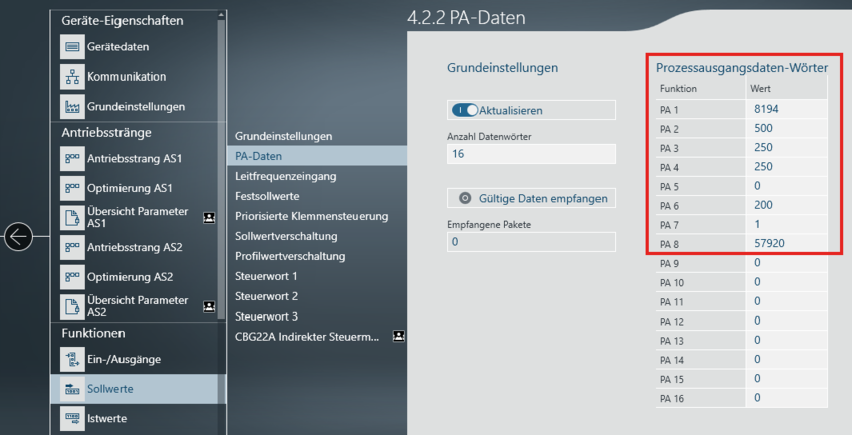 Gleichzeitig können Sie in MOVISUITE® unter [Funktionen] > [Sollwerte] > [PA-Daten] die eingehenden Daten des Umrichters einsehen.