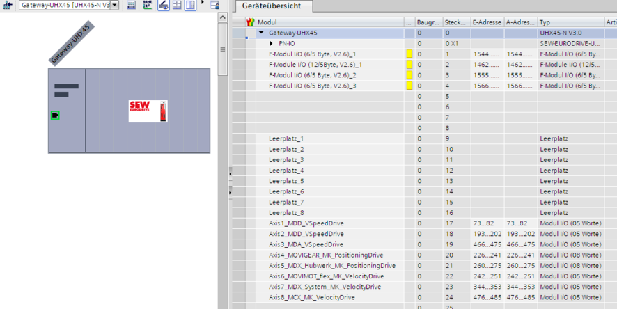 Die verwendeten F-Module in den Steckplätzen 1 – 4 repräsentieren die PROFIsafe-Kommunikation der Sicherheitsoptionen in den Achsen: