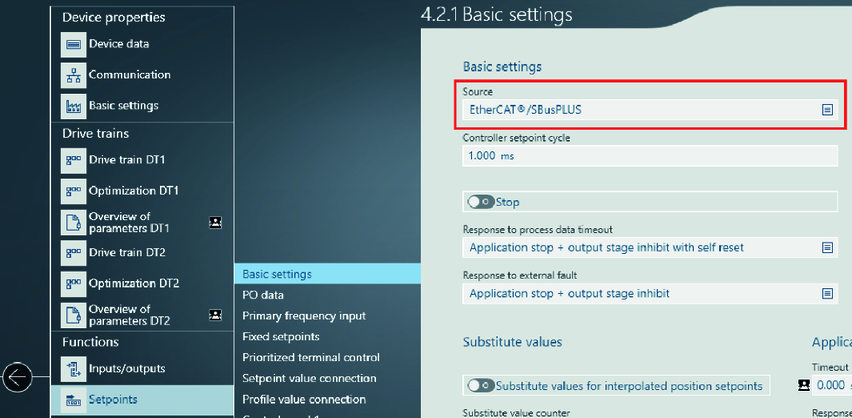 - Under [Setpoints] > [Basic settings], check for each inverter whether the value "EtherCAT®/SBusPLUS" is set as the "Source". For MOVIMOT®, MOVIGEAR® of the DSI communication class or MOVITRAC®, the value "Standard fieldbus system" must be set as the "Source". The value "EtherCAT®/SBusPLUS" then appears under "Standard fieldbus system".