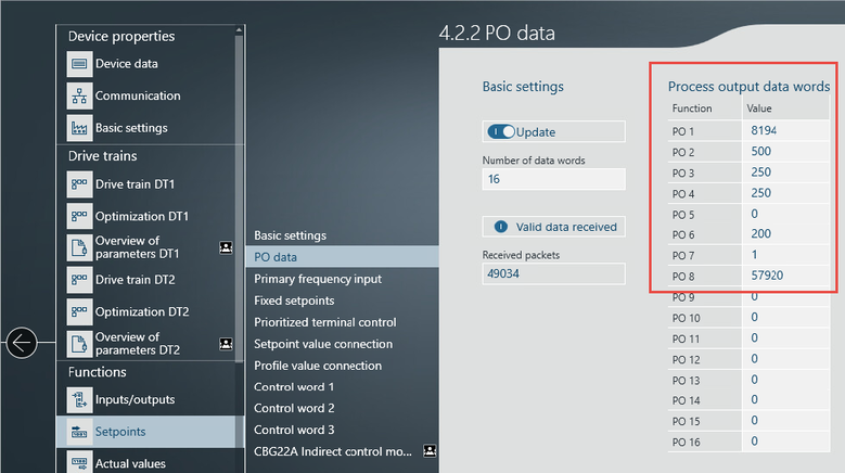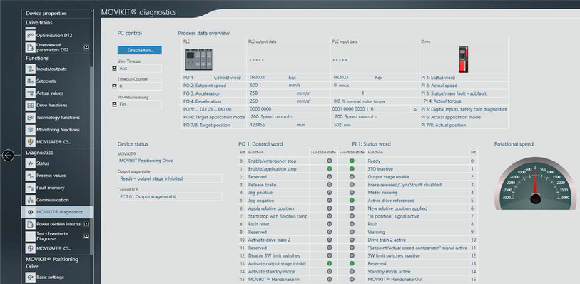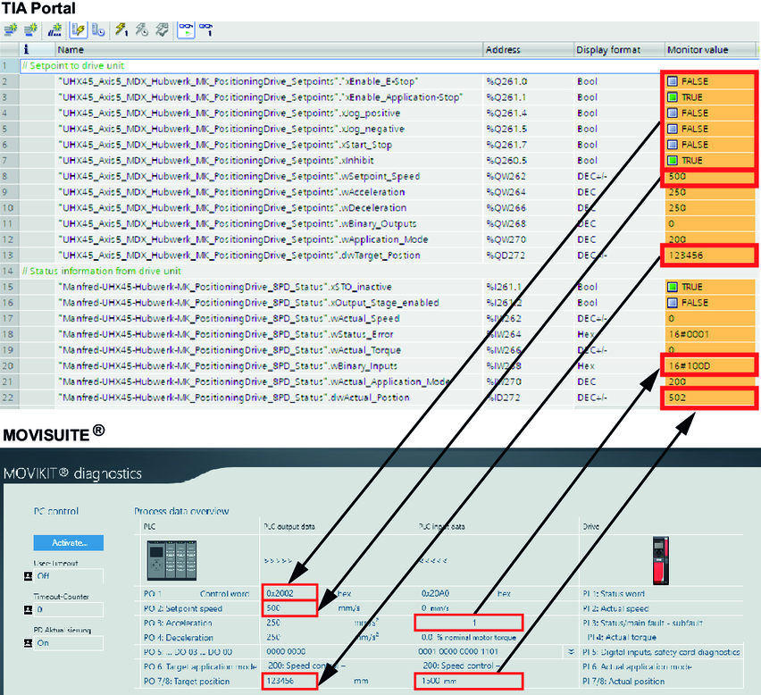 For diagnostics, you can track the process data in the engineering tool of the PLC (e.g. TIA Portal), in the IEC Editor, and in MOVISUITE®. This allows you to diagnose data transmission on the fieldbus as well as data transmission via the SBusPLUS.