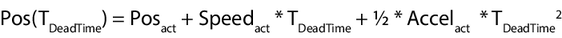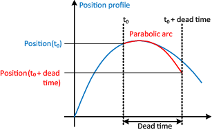 Descriptively, this means: The position profile is extrapolated at each point by a parabolic arc with the same slope (velocity) and the same curvature (acceleration). Based on this parabolic arc, the position is calculated after the dead time has elapsed. Significant deviations occur when the acceleration changes significantly within the dead time.