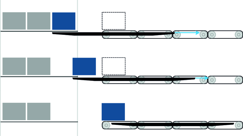 The combi telescope can be implemented with one and up to a maximum of four belts. When using several belts, all involved belts are moved synchronously in the operating modes "Storage" and "Retrieval". Furthermore, the storage or retrieval process can be performed for one box at a time or for several boxes together.