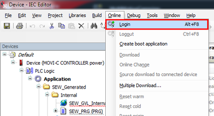 • The IEC Editor performs the login to the MOVI‑C® CONTROLLER.