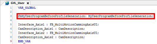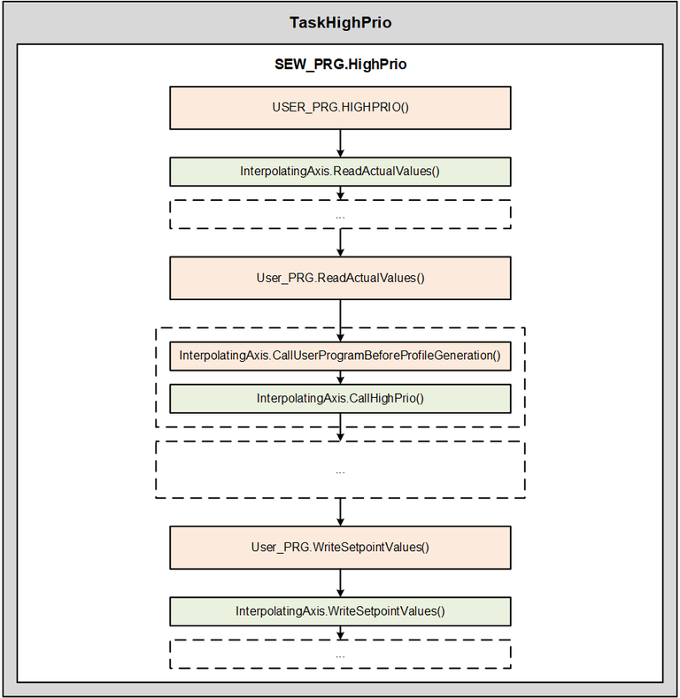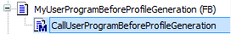 [4] | User_PRG | The user program is created once, initially, by automatic code generation. Since the program is not overwritten with each subsequent creation, this is the appropriate place for integrating user programs. The program is divided into five actions. These actions differ in the time at which they are called during the program sequence. |