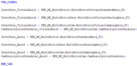 [1] | SEW_GVL_Internal | The SEW_GVL_Internal global list of variables contains the instances that correspond to the software module used. These variables may not be written to from the user program. |