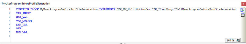 [2] | SEW_PRG | Program that contains all the important instance calls. Automatic code generation recreates this program in accordance with the configuration made in MOVISUITE® each time the IEC project is created, thereby overwriting the previous version. Therefore, you should not make any changes to this program. |