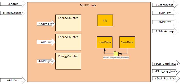 For operation, "Multi-counter" energy meters have the LoadData and SaveData functions. While the LoadData function overwrites the actual values with stored values, the SaveData function saves the current values on the file on the memory card (only one data set is saved). The data is not saved automatically but must be explicitly saved by running SaveData in the application program. A power failure is not covered by this function. In this case, there is the option of creating the run variables in the retain memory.