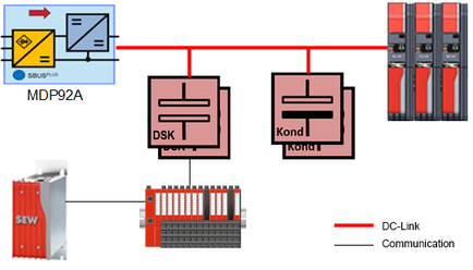 Dabei können Energiespeicher zum Einsatz kommen, die entweder ungeregelt im Zwischenkreis verbaut sind oder mittels MDE90A an den Zwischenkreis angekoppelt werden. Folgende Grafik zeigt eine entsprechende Beispieltopologie: