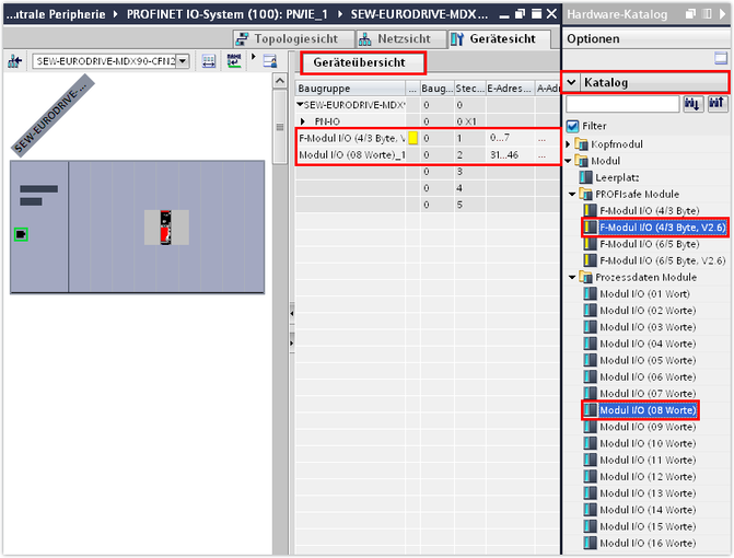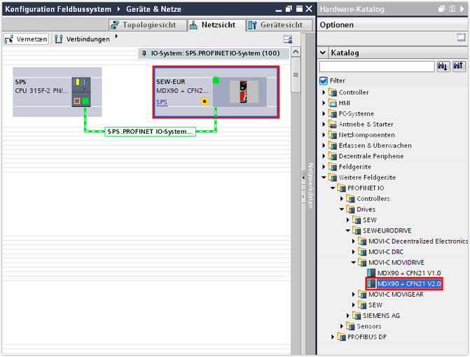 - Öffnen Sie den Hardwarekatalog. Wählen Sie unter [Weitere Feldgeräte] > [PROFINET IO] > [Drives] > [SEW-EURODRIVE] > [MOVI-C MOVIDRIVE] den Eintrag für den Applikationsumrichter MOVIDRIVE® technology und weisen Sie diesen in der Netzsicht der SPS zu.