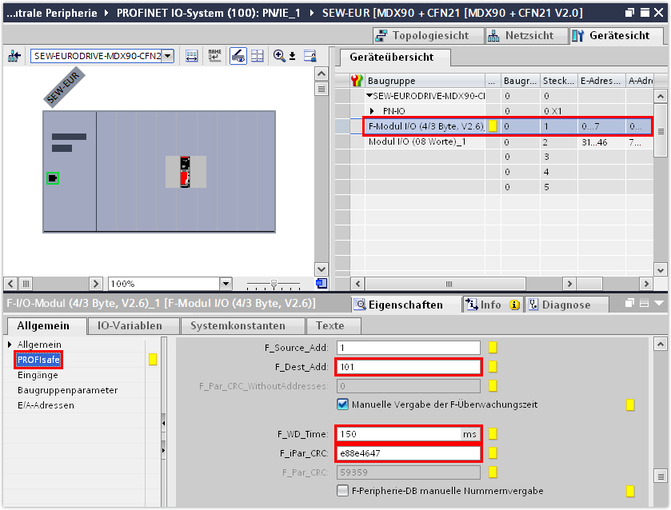 - Tragen Sie im Inspektorfenster (unterer Editorbereich) in der Gruppe "PROFIsafe" aus dem Abnahmeprotokoll ermittelten Werte der Sicherheitsparameter ein (siehe F_iPar_CRC):