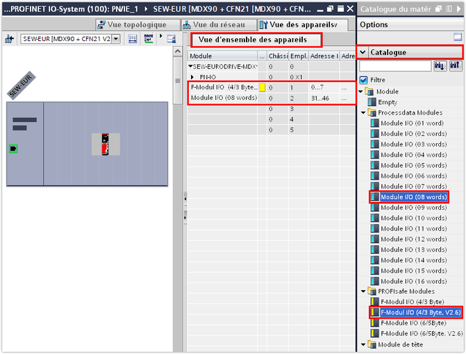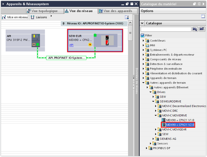 - Ouvrir le catalogue matériel. Sous [Autres apapreils de terrain] > [PROFINET IO] > [Drives] > [SEW-EURODRIVE] > [MOVI-C MOVIDRIVE], sélectionner l'entrée pour le variateur d'application MOVIDRIVE® technology et affecter celle-ci à l'API dans la vue réseau.