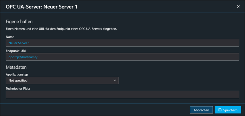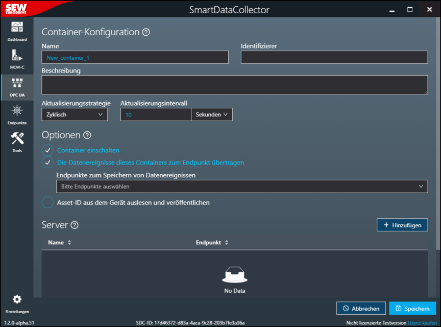 Im Menü "OPC UA" erfolgt die Verwaltung angeschlossener OPC UA-Server (Sensoren, Steuerungen, Geräte anderer Hersteller) sowie das Hinzufügen und Konfigurieren der Daten-Container dafür. Die Software fungiert als OPC UA-Client, der sich mit dem OPC UA-Server verbindet.