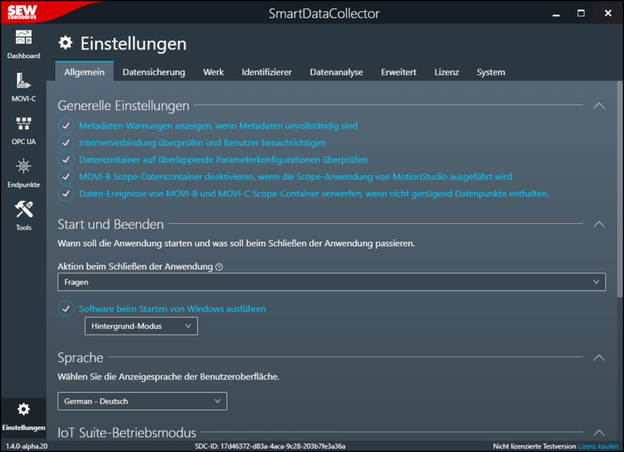 Im Menü "Einstellungen" können über verschiedene Register Grundeinstellungen wie z. B. die Sprache der Benutzeroberfläche oder Festlegungen zur Datensicherung vorgenommen, aber auch Informationen zum Werk hinterlegt und technische Daten der Software eingesehen werden. Zudem erfolgt hier die Verwaltung Ihrer Software-Lizenz.