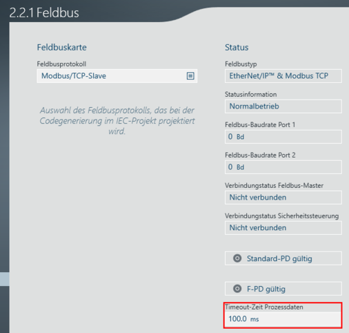 Bei Überschreiten der Timeout-Zeit für die zyklische Kommunikation wird die entsprechende Fehlermeldung "Feldbus-Timeout" ausgegeben.