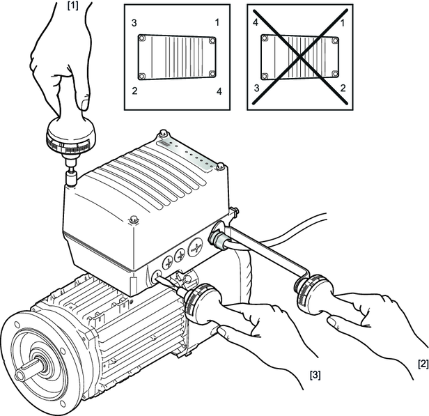 [1] | Tighten the screws in diametrically opposite sequence with a tightening torque of 6.0 Nm (for size 1) or 9.5 Nm (for size 2). |