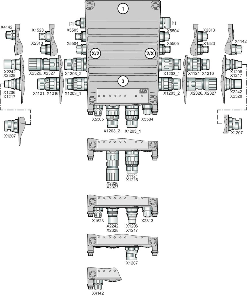 X1523 | Gris claro | Tensión de apoyo de 24 V CC – EntradaEl conector enchufable X1523 también se puede pedir individualmente (es decir, sin el conector enchufable X2313). | X, 2 o 3 |