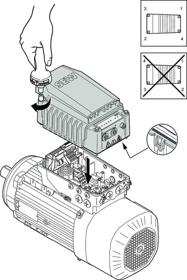 - 安装电子设备盖板时,请注意以下操作步骤:放上/旋入螺栓,并用9.5 Nm的拧紧扭矩十字交叉逐步拧紧。