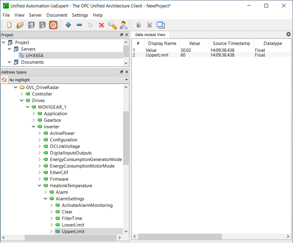 - Im Bereich"Adress Space" werden die Variablen des OPC UA-Servers angezeigt.