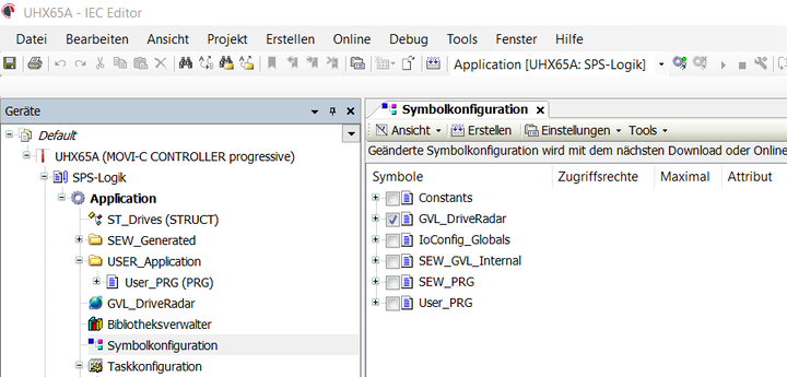 - Definieren Sie in der Symbolkonfiguration des geöffneten IEC-Programms die gewünschten Prozessdatenwerte für die Kommunikation über OPC UA. Wählen Sie dabei die im Rahmen der Inbetriebnahme des Softwaremoduls erzeugte globale Variablenliste GVL_DriveRadar aus.