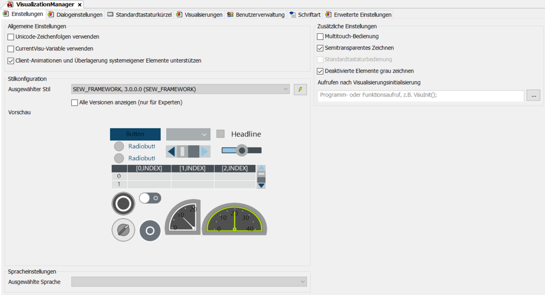 - Wählen Sie in der Konfiguration des Visualisierungsmanagers im Bereich "Stilkonfiguration" in der Auswahlliste "Ausgewählter Stil" den Eintrag "SEW_FRAMEWORK, 3.0.0.0 (SEW_FRAMEWORK)".